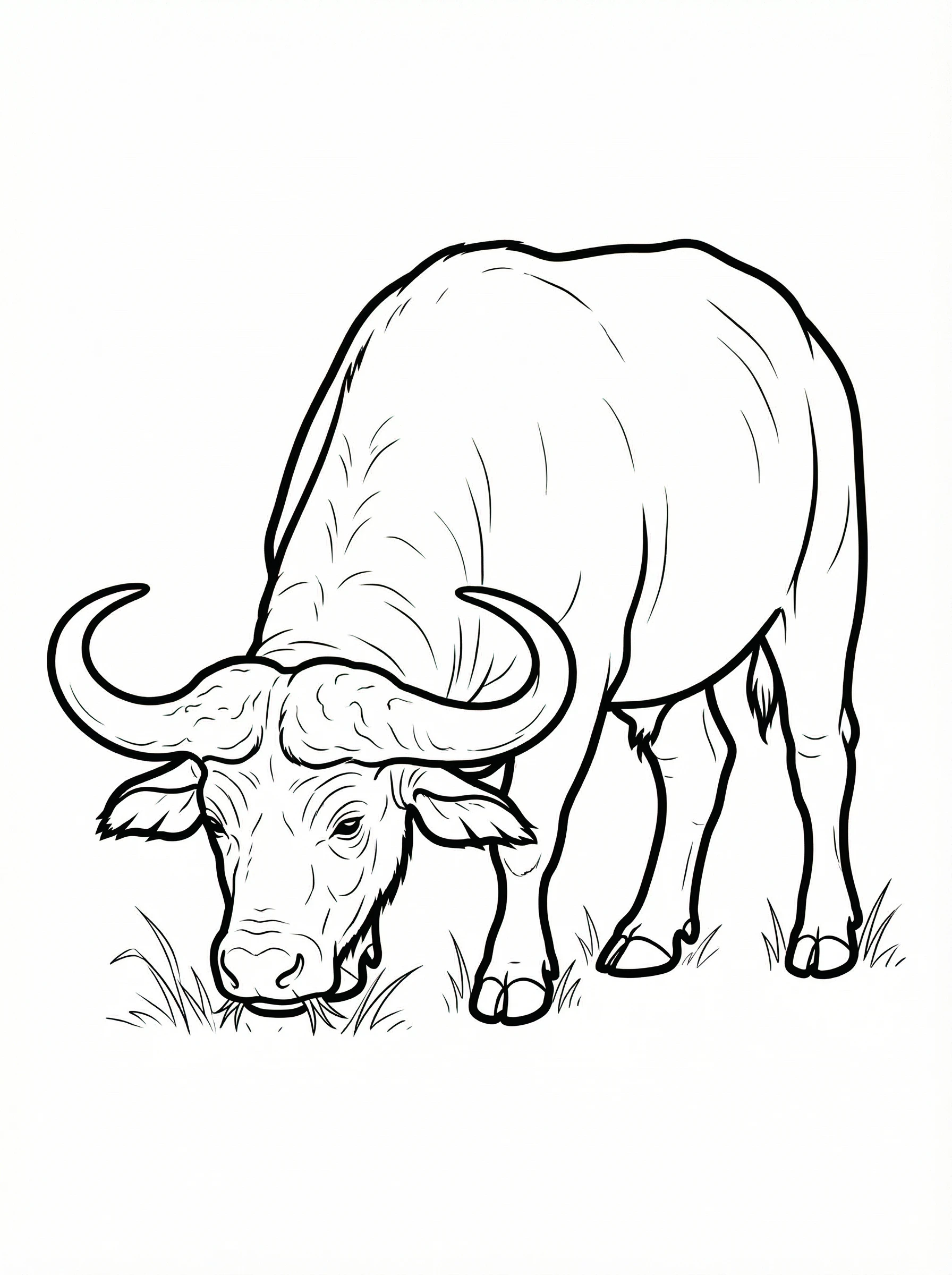 Print this majestic Cape buffalo coloring page! The powerful animal is captured with its head down, grazing peacefully in the grass.