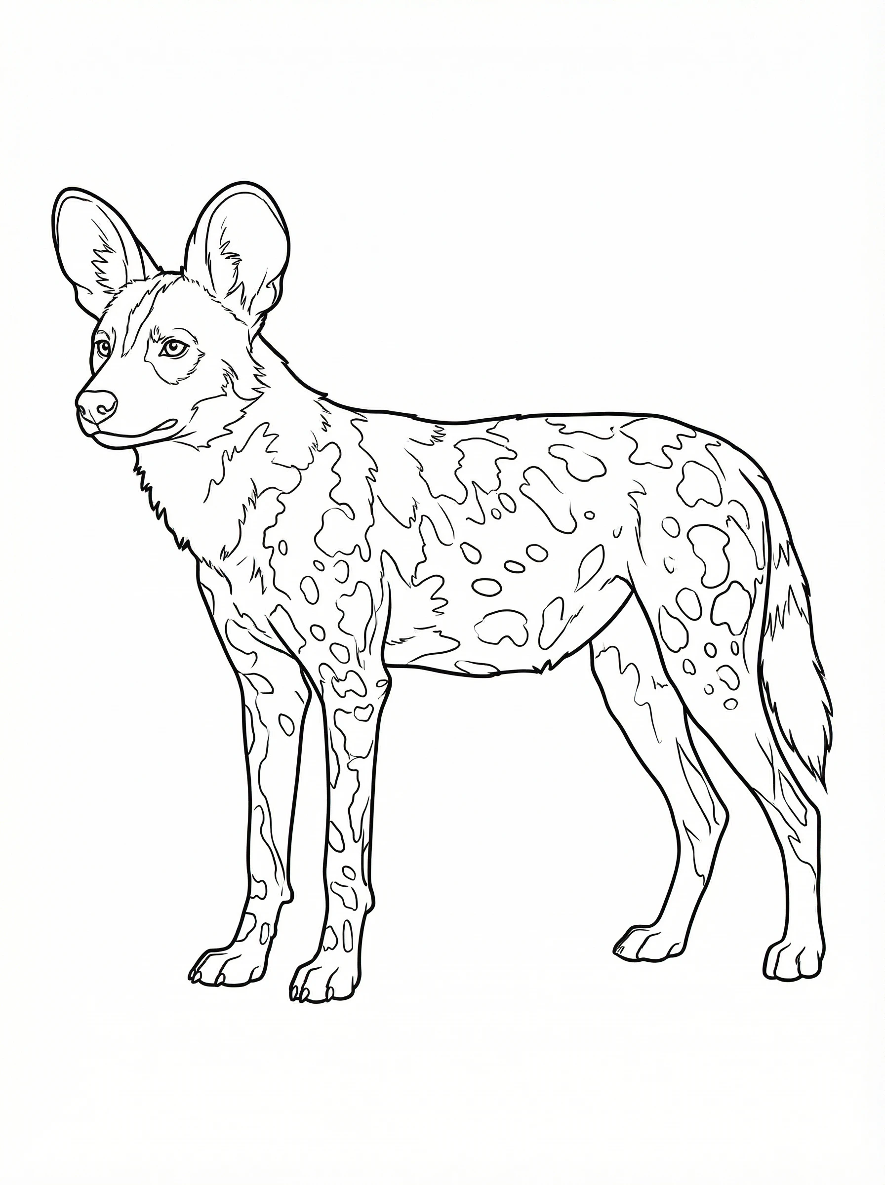 Print this alert African wild dog standing tall. Capture the unique beauty of its large rounded ears and distinct spotted coat pattern.